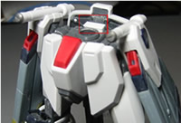 上半身が羽の重さに負けて後ろに 傾くので腰部にプラ板を貼り、 ストッパーとしました。 3.5ミリほど貼りましたが、 ちょっと上半身のポージングが キツくなるので少し削ってやりました。 | こちらは足の裏。 バーニアがちょっと寂しいので 「丸ノズル」でデティールアップ。 そのままじゃちょっと凸っと出てしまうので 丸ノズルを薄く削ってフィットさせました。 |